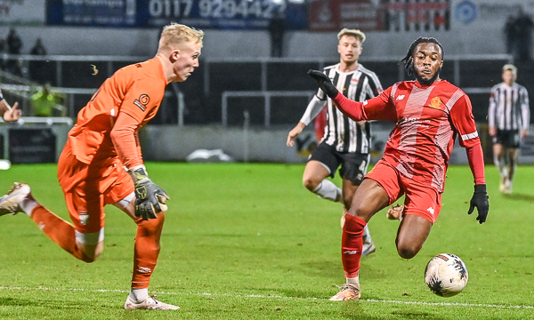 Tristan Abrahams was sent clear by Kain Adom and tried to clip it home but Bath goalkeeper Will Buse made himself big and blocked the shot with his chest.