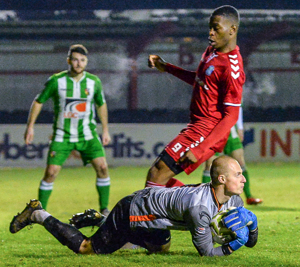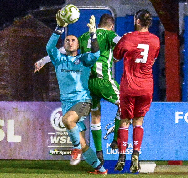 The deadlock was almost broken when Rusthall next attacked, A goal-bound shot hit Charlie Clover who couldn’t get out of the way. Beckenham goalkeeper Marvin Grant flew out and went through Adams then as Rusthall appealed for a penalty it came out to Camacho who made space for himself well before his shot crashed back off the post.