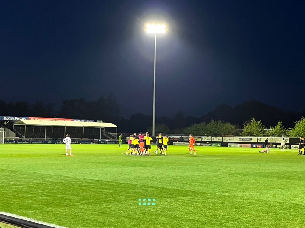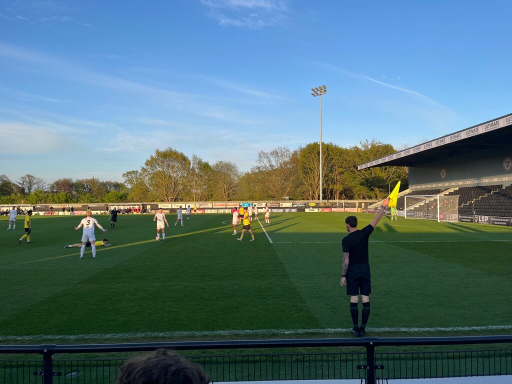 With one floodlight at Hayes Lane not working, the far corner of pitch was a little gloomy, but Referee Howard Collins made the sensible decision to carry on with the match.