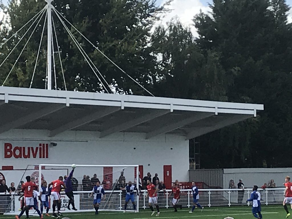 Erith & Belvedere had to come up with something before the end of the half and managed to do so when Arthur Feudjiro twisted and turned his way into a shooting position that forced Jordan Carey to push the ball away.