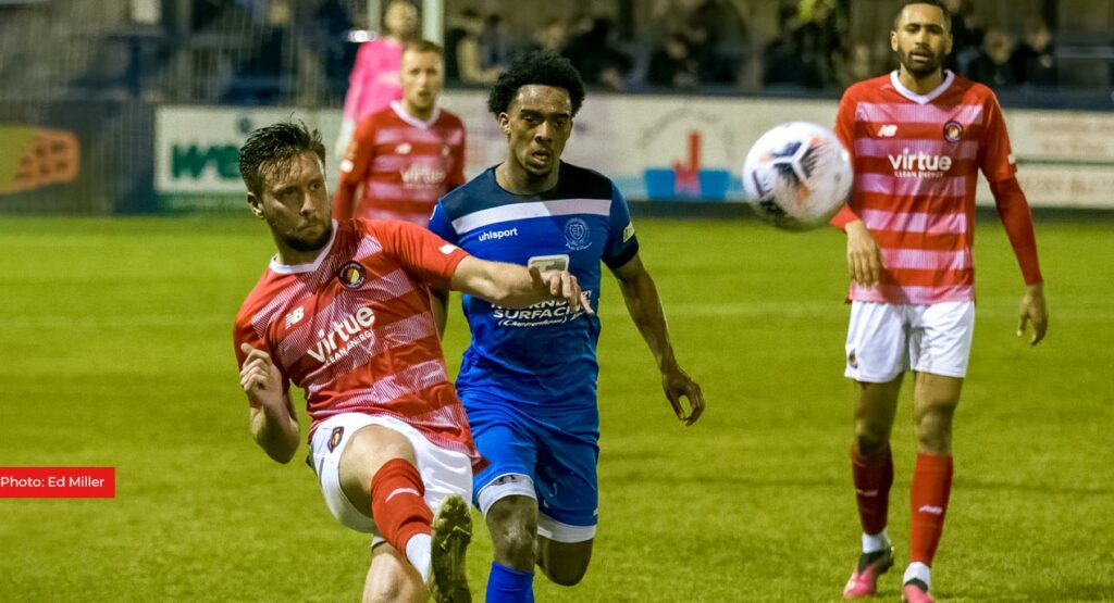 The result of that was a lack of fluidity and ball retention and both sides were guilty of losing possession. McQueen almost linked up with Bingham but he was unable to get an effort away on goal before Will Tizzard almost released Alefe Santos at the other end. “Almost” was the buzzword of the evening as neither side could really fashion a solid opportunity. Chippenham showed good forward movement when they got away on the break but their finishing was wayward.