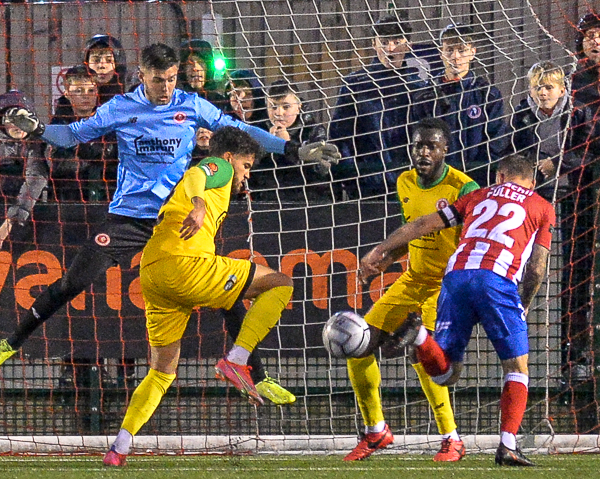 However, in the fourth minute, Dorking levelled. A cross was headed out and Niall McManus met it with a twenty-five yard volley that flew into the top corner.