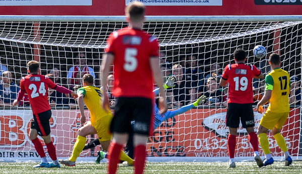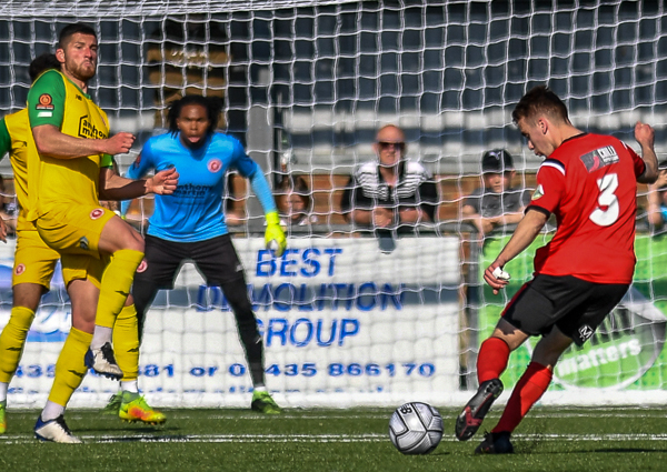 Bradley Pearce did well to head out a dangerous free kick before Walker put another dead ball opportunity wide of the near post. James Hammond headed just wide from a Greg Luer deep cross before the hosts went ahead. Although Hammond’s original shot was blocked, Charley Kendall collected it and fired it into the top corner.