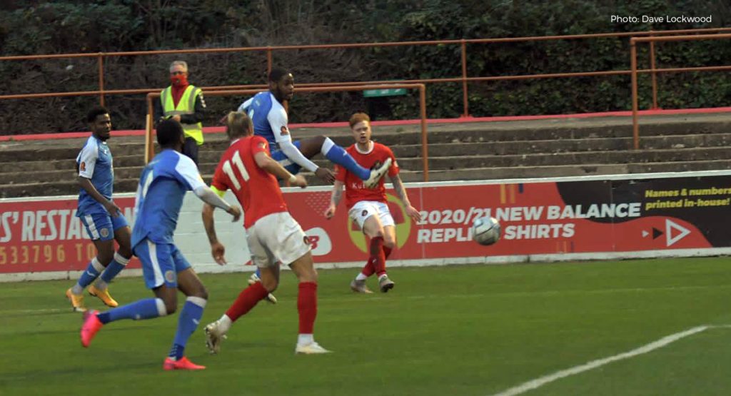 In the sixth minute Ben Greenhalgh saw his 30 yard shot go past the post. Tonbridge were defending deep and catching Ebbsfleet on the counter, in the 19th minute Greenhalgh put Khale De Costa in on the right wing, his low cross saw Tom Wood slide in for it but he couldn’t make a connection.