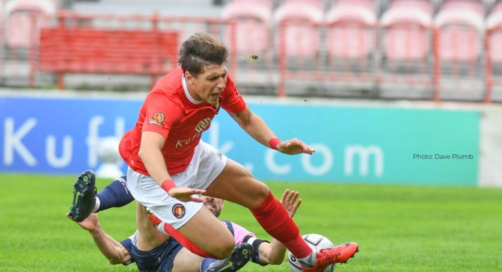 It was an all-action 10 minutes as the red card came next. The clock was ticking towards the half-hour mark when Goodman stretched to recover his pass in midfield but Ruben Sammut got their first and the Fleet defender slid in to upend the Dulwich man. That earned the referee’s wrath as well as the opposition’s and Goodman was issued his marching orders.
