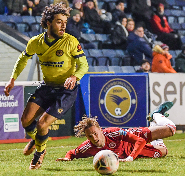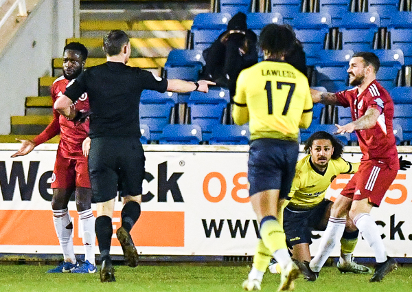 With fifteen minutes remaining, Farnborough were gifted a great opportunity to break the deadlock against the run of play. Barnes brought down Saled on the edge of the area but referee Dale Wootton decided it was inside and pointed to the spot. He was persuaded to confer with an assistant but did not change his mind before some pushing and shoving ended with three players cautioned.