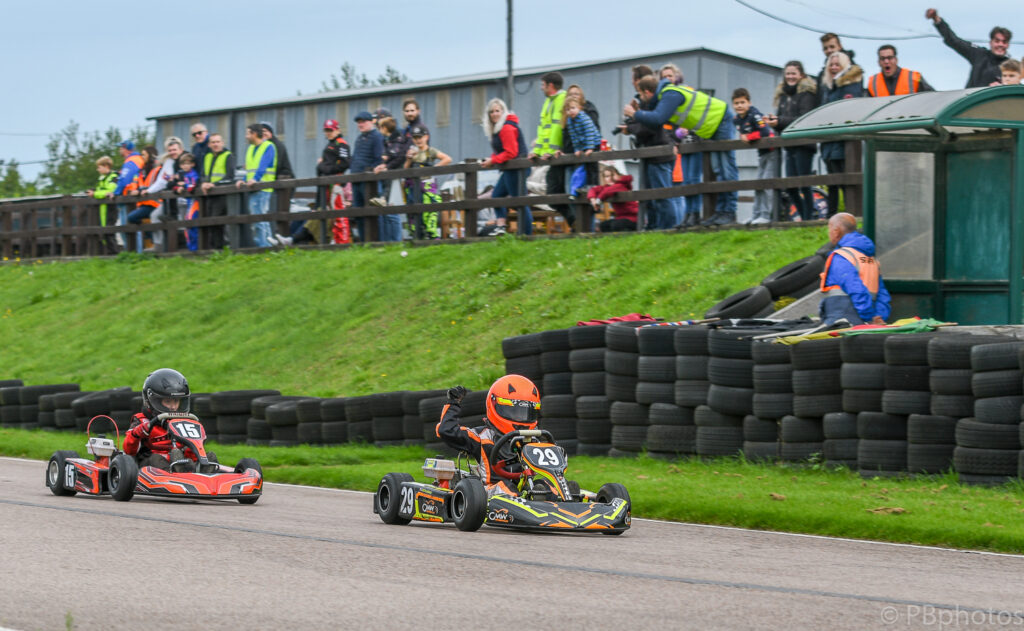 He made his attempt to pass the Gtech kart at the tight left hander that leads onto the infield straight, it was a move that has worked successfully in the past for notably Jack Bartholomew; this time however it wasn’t to be for the brave Tomsett, as Ives had already committed to his normal racing line for the corner, Tomsett rode over the inside kerb and tried to steer away from Ives’s machine but got out of shape and glanced the side of the number 47 Gtech kart.