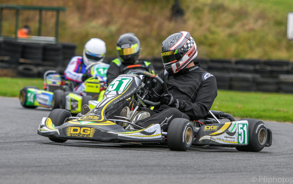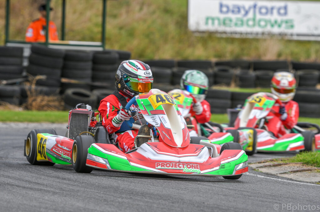 Back at the front the Project One kart of O’Sullivan was in control of the race and motored onto victory, finishing 1.2s ahead of Wratten, who had dispatched Hare on lap 5 before closing down on the leader to take the runner up slot. Hare crossed the finish line in 3rd only to find that he had collected a nose fairing penalty along the way, dropping him down the order to 7th.
