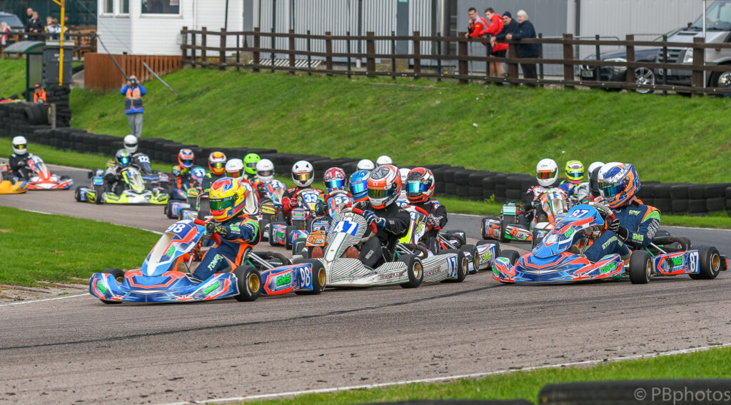 At the green light on the rolling start Tomsett held his cool to lead into turn 1, from Ives who had made the most of his inside grid slot to move in front of Stephenson as they turned right and headed down to the first hairpin, the 24 karts making for a spectacular sight as they snaked their way around the opening lap, commendably without any major off track incidents.