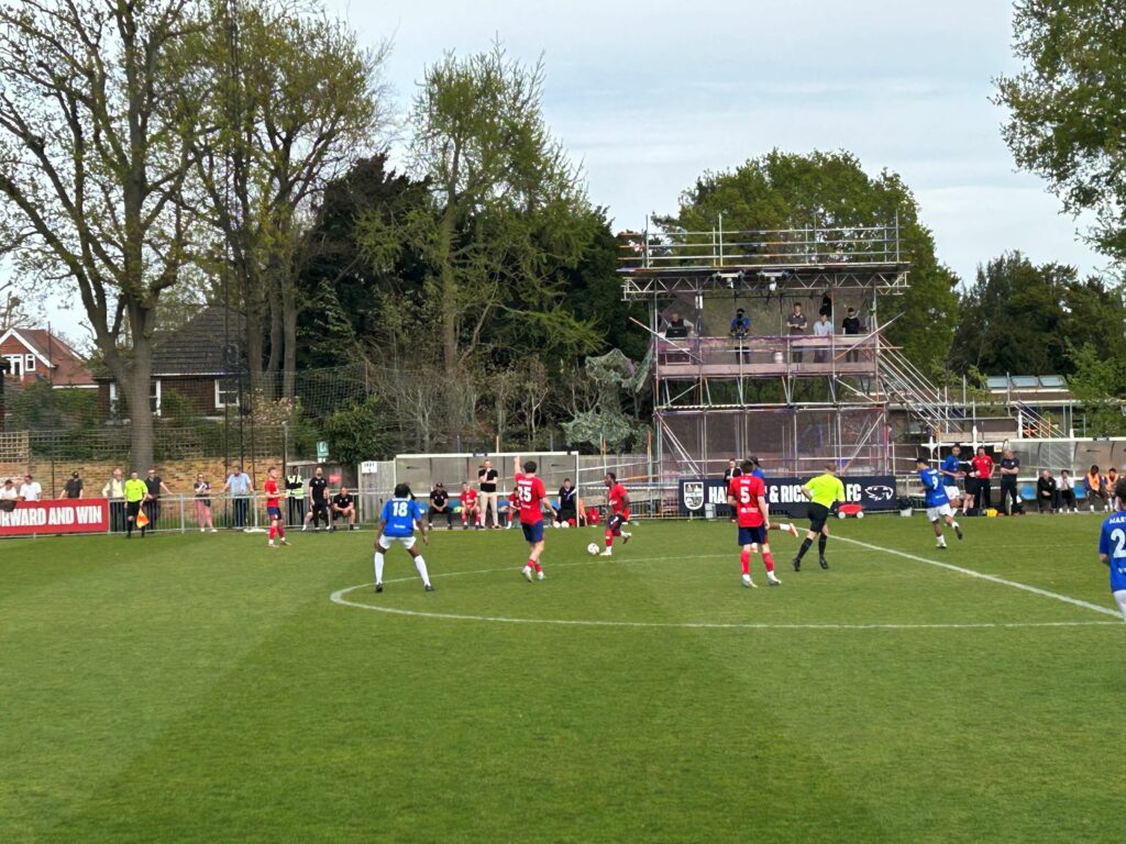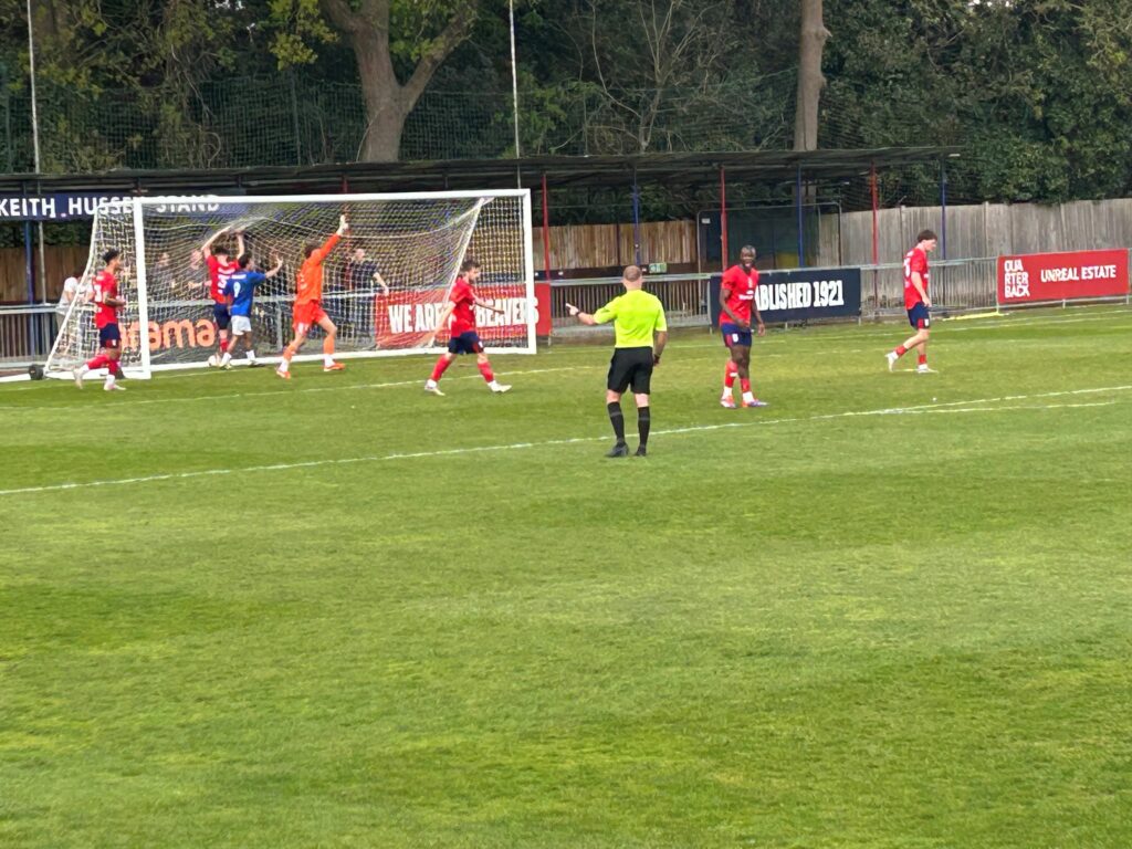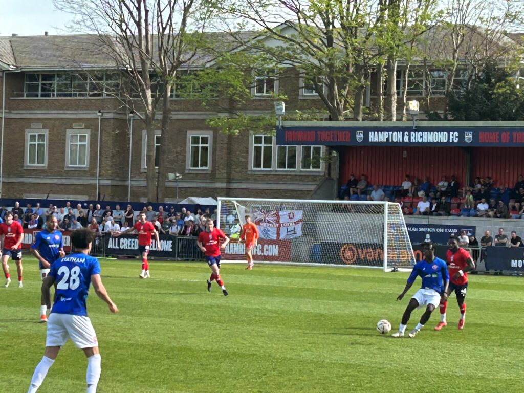 Looking for a quick response, Sahid Kamara hit a swirling shot that was tipped over brilliantly by Hampton goalkeeper Max Merrick, on loan from Chelsea. Sam Cornish delivered the corner to the far post and Riccardo Di Trolio was stretching when he met it and couldn’t keep his header down.