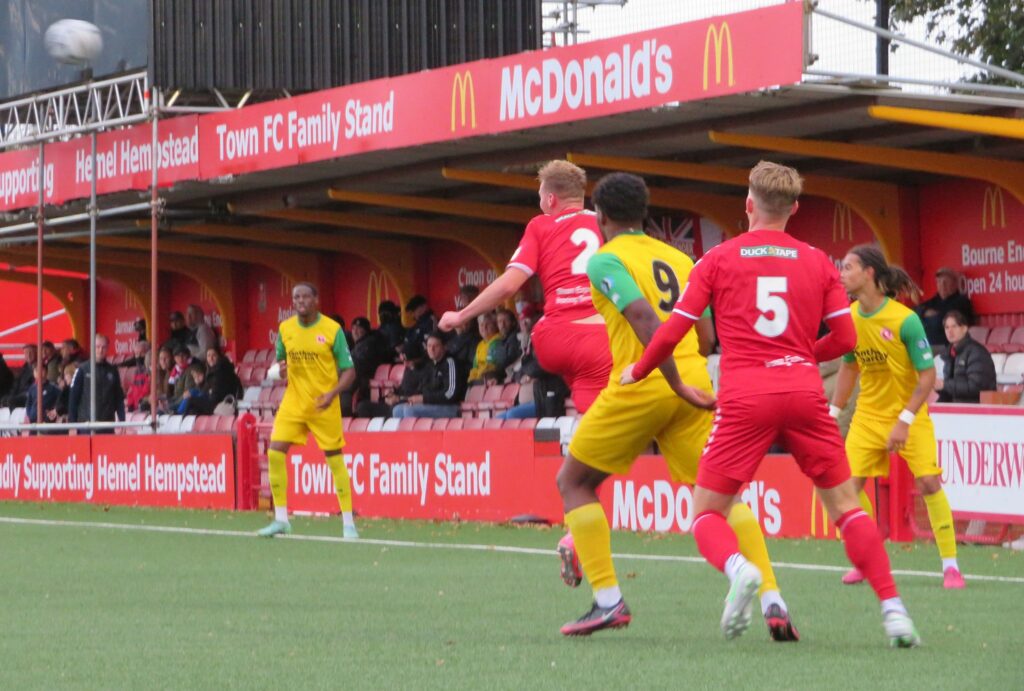 The deserved goal for Hemel Hempstead came on 41 minutes. Hemel Hempstead captain, Sam Mentom, had a fierce left foot shot from the edge of the area which Jack Sims saved at the expense of a corner. Taking the corner himself, Sam Mentom found Joash Nembhard near the penalty spot and his bullet header went in to the top corner of the net.