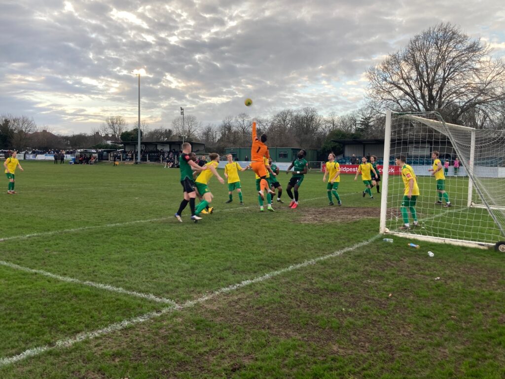 The next thirty seven minutes were tightly fought with chances few and far between. The best were when Oscar Housego headed wide for Corinthian and Malaki Toussaint’s first time side-foot volley flew just over for the hosts.