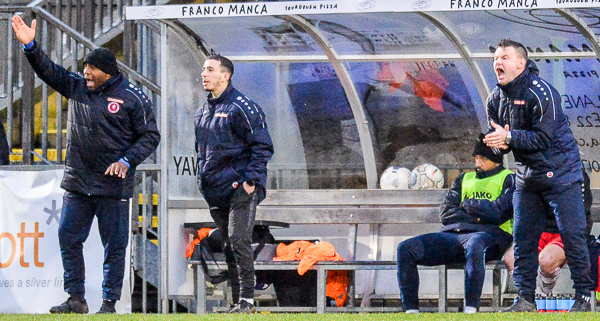 Swaine’s absence meant that there was no natural centre half on the bench so Connor Dymond covered. Quinton was pleased with his contribution saying “Hes done well, Connor. Hes been out, ten yellow cards, so he missed out on two games. Discipline needs to be better for everyone at this stage of the season but he’s a player that can do all over the park if necessary.”