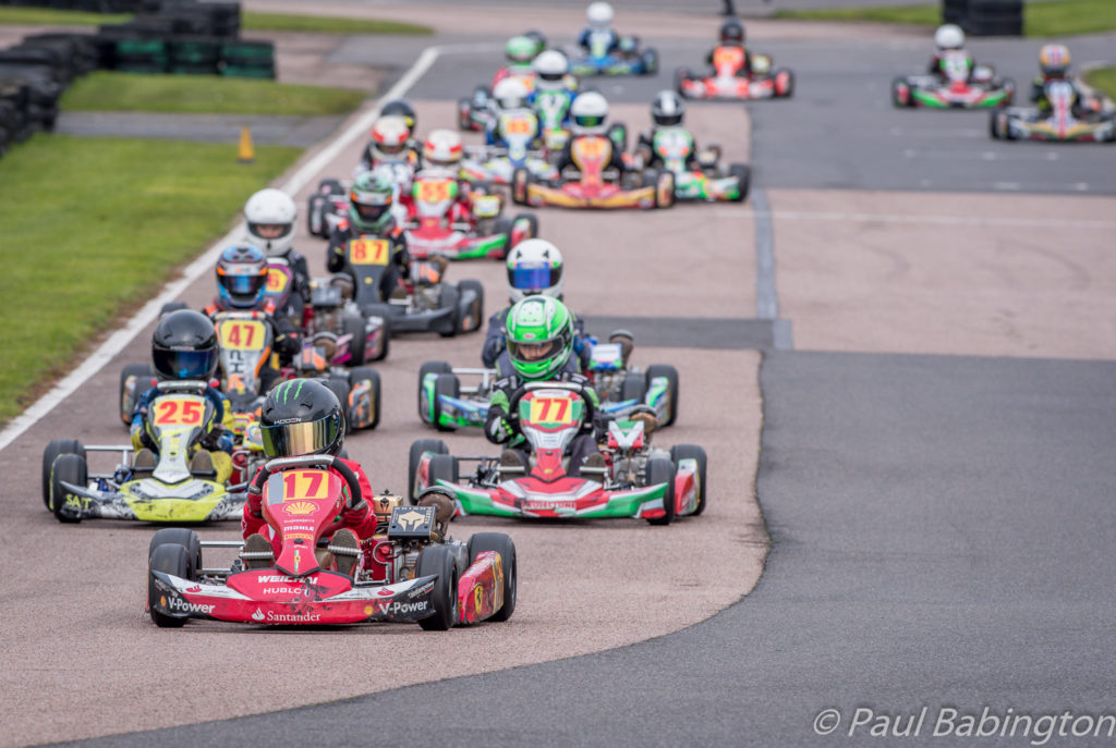 Rice and Steadman led the colourful 24 kart field into turn 1 and down to the tricky turn 2. Behind leader Rice, Steadman was forced wide by Hodson-Brown and Lee having then to defend heavily into the first infield hairpin, as Brough, Stephenson and Tomsett were all over him.