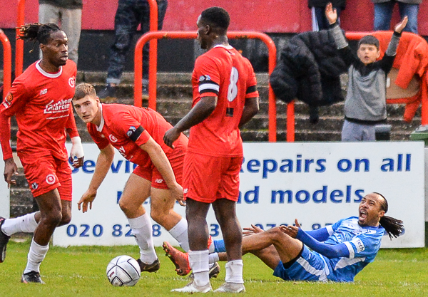 Henly saved Carr’s header from Barnes’ cross before McKimm made a double substitution to change formation and match up with Welling. From that point on, the Angels looked the more threatening and Welling had to dig in.