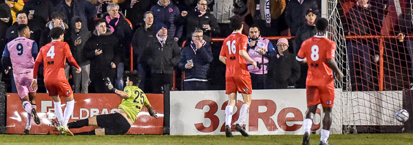 Arthur Penney headed over before Welling reduced the arrears with thirteen minutes remaining. Akinyemi’s shot was handled in the penalty area and the Welling striker converted confidently from the spot.