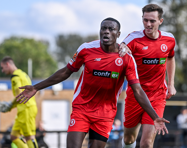 Reuben Reid had Weston’s first chance when bringing down a long cross-field pass on his chest and his fierce drive clipped the bar on the way over, presumably via a tip by Rhys Lovett as a corner was awarded. It was half cleared as far as Daniel Martin who did well to find Chukwu on the counter. He clipped it forwards and, despite attempts to hold him back, Gene Kennedy went in chase. Weston goalkeeper Max Harris was alert to the danger and burst to just get there first.