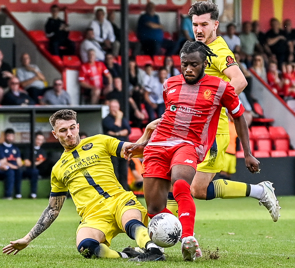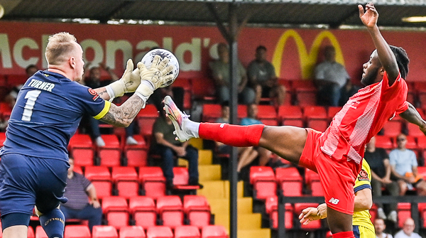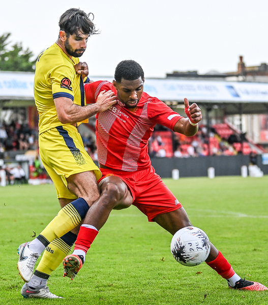 Connor Hall fired over the near post for Farnborough then Papadopoulos had a shot saved by Turner at the other end. Farnborough substitute Jayden Davis was exceedingly fortunate not to be dismissed for a second yellow card for a cynical foul having already had a warning. After Byrd had made an excellent block from Folivi, Davis suffered the ignominy of being a substituted substitute.