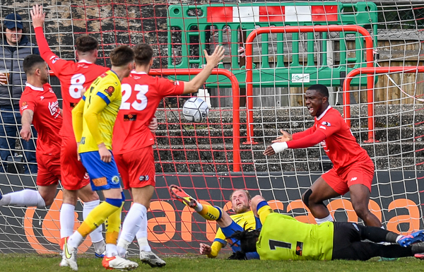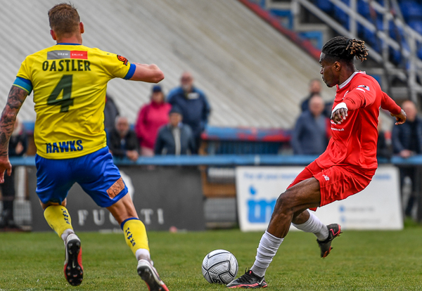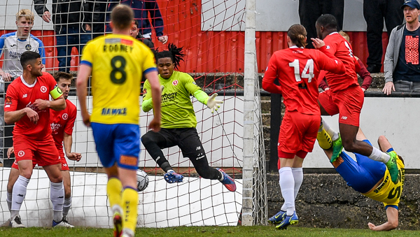 Ben Shroll’s header was hooked away from Coniah Boyce-Clarke by Scott Rendell, with nobody able to get on the end of it to finish then Jake McCarthy’s flying effort went wide. Billy Clifford’s free kick fell into the path of Paul Rooney, but Wells did well to charge down his effort.