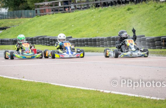 Berta led the Final away from the start with Perilly following him closely Williamson was up to third ahead of Lloyd in 4th. After 4 laps it was clear to see that Perilly’s kart had more pace than the leader’s Berta and he moved ahead, soon pulling away and cruising to victory once again at the circuit. Berta was overtaken by Williamson who had driven well after his spin in the heat, only to have his deserved 2nd place taken away by a nose drop penalty, possibly caused by hitting a kerb.