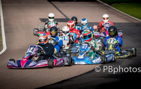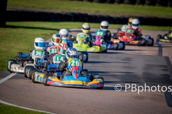 Springate pulled clear of good battle for third which had SAIT driver – Tom Richards leading a close group consisting of Ryan Haines, Josh Bacon, Mike Ashby and Joe Hunt. Mid race drama intervened amongst this bunch as Richards started losing pace eventually succumbing to a loose exhaust, he had bunched those behind up which caught out class newcomer Joe Hunt, who drifted wide onto the grass coming onto the start finish straight, ending his race in the tyres opposite the finish line, with a heavily damaged Project One kart and sore wrist.