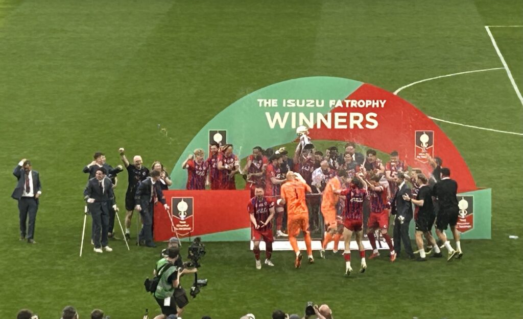 One time Bromley player Ryan Jones, and Welling’s player of the season in 2023/24 Lachlan Byrd, were both absentees through injury but joined the players on the pitch to join in the post match celebrations.