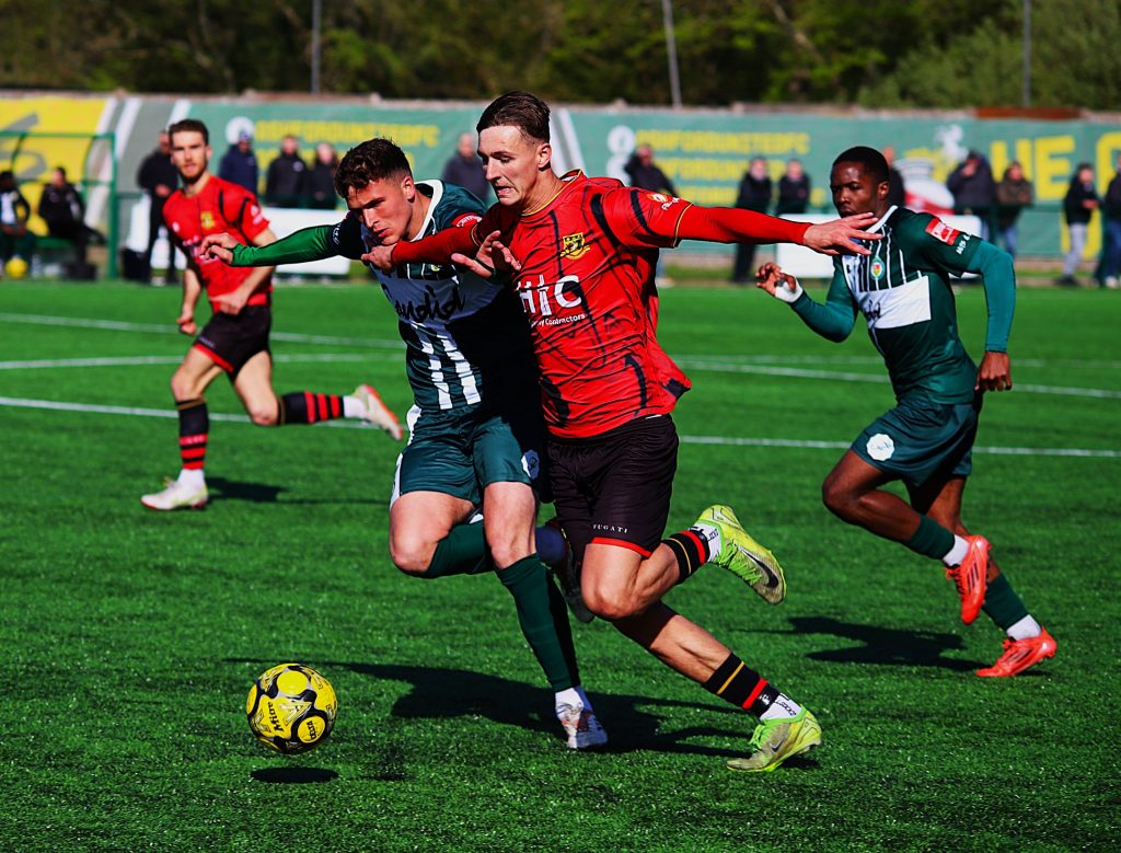 A goal behind, the visitors created chances, one of which should have been taken before the break – Swift had a header cleared off the line from a Richie Hamill corner; Jean-Baptiste Fischer sent an angled lob bouncing wide; Jack Steventon couldn’t get the required connection on another Hamill freekick and from a hanging Hamill ball into the box, the half clearance went straight to Swift who fired well over.
