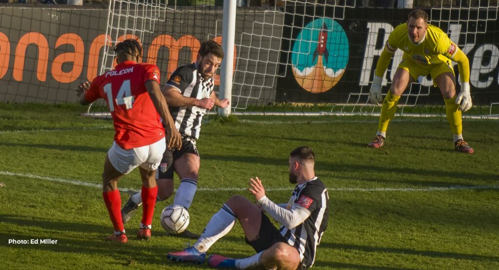 And it was the perfect start for the Fleet after they’d cleared from Omar Holness’ run behind the back line in the first attack of the game. Two minutes in, Paxman – playing wide on the left – found Tanner who crossed into the middle of the box. Chapman appeared to be flattened by goalkeeper Ryan Clarke as he rose to challenge and as the Bath defence stopped, Shaq Coulthirst dug the ball free. Chapman got off the floor to then hook it behind him and into the net with confusion reigning supreme in the home defence.