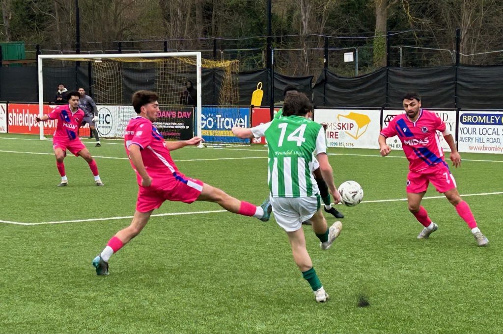 Twenty-four minutes into the second period, Rusthall scored their crucial second goal. Having just come back on to the field of play following a lengthy spell of treatment, Rahman Kareem went on a long diagonal cross-field run before his clever reverse pass sent Reid clear. The lively wide man made no mistake when finishing with aplomb. That proved to be the end of Kareem’s participation as he had to be helped off and replaced by Thompson Adeyemi.