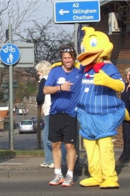 Sporting his Gillingham strip, the duck kept pace with Bishop who picked up his next celebrity friend, DJ Chris Moyles at the Tesco roundabout on his way to Gillingham.
