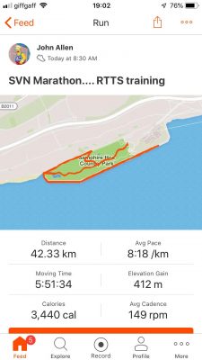 Everything was going well until about lap 7, when the wind picked up and made the exposed sea wall section very hard. I struggled through to 8 laps, about 42km, marathon distance, before I ran out of time. I was relatively happy – I had followed my strategy for Race to the Stones by walking the hills, but due to the wind and my tiredness, I walked most of the last lap. I was disappointed not to have got to 9 laps, but it was still a good distance to do for my training.