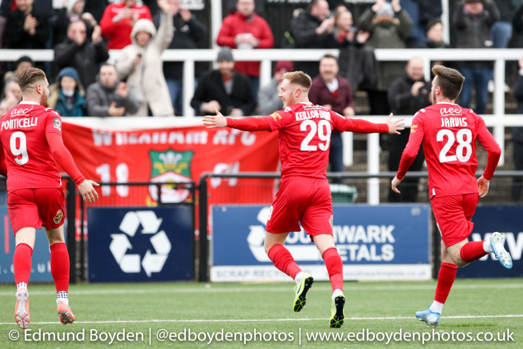 With the wind having an effect on the game, it was Wrexham who adapted quickest to the conditions hitting the post as early as the 7th minute when Jordan Ponticelli was played in on goal.