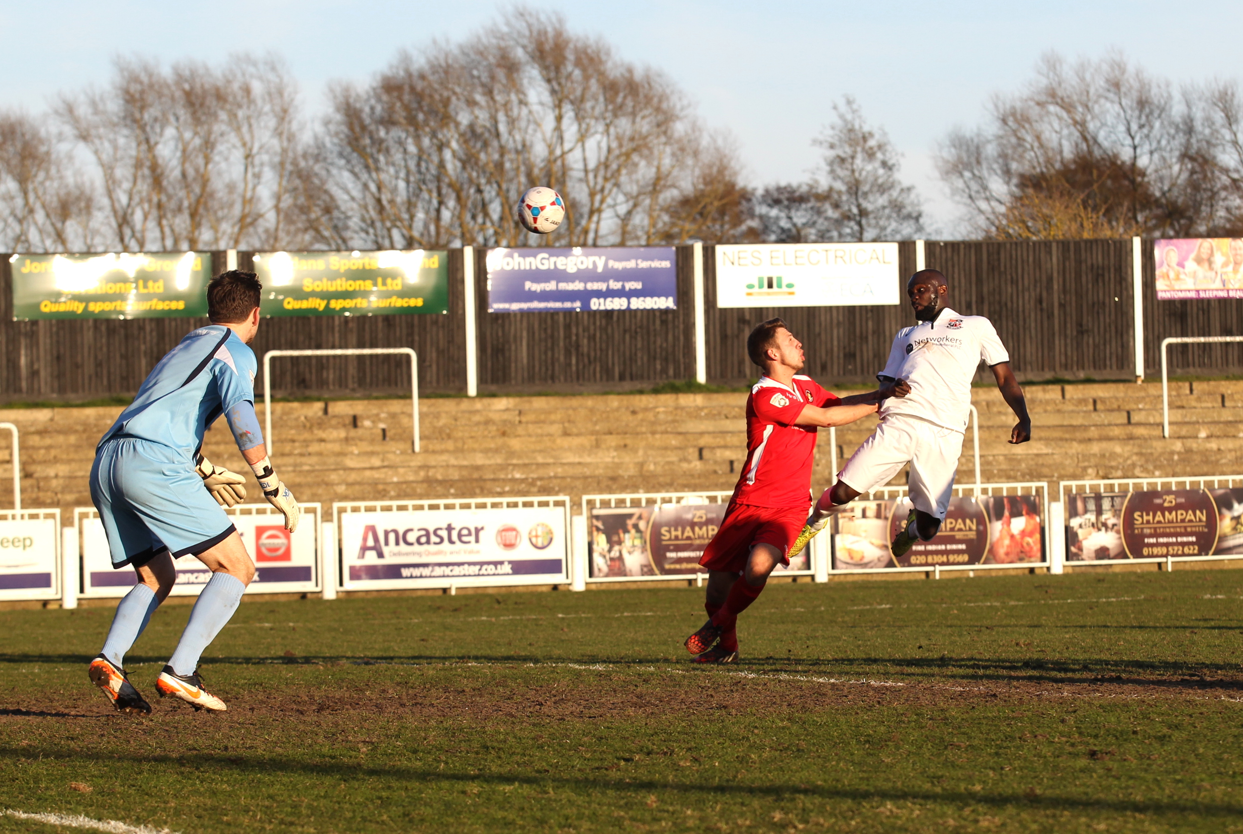 Ali Fuseini of Bromley heads wide during the Vanarama Conference South match between Bromley and Ebbsfleet at Hayes Lane, Bromley, Kent, England on 7 March 2015. Photo by Edmund Boyden.