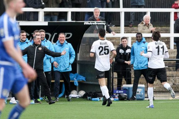 Goals: Bromley – Rees 72, Bugeil 90mins. Guiseley – Rooney 87mins.