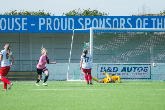 It was the Swale side who were quickest out of the blocks as Natalie Long was twice denied and then scored in less than a minute. A long ball forward released the Swale striker who was first of all brilliantly denied by Bromley keeper Kirsty Higginson, and then as the ball span around in the box, the keeper tried to push the ball to safety but only succeeded in pushing the ball into Long forcing the Bromley keeper into a smart save to give away a corner. From the flag kick, Higginson lost her bearings completely leaving Long with the simplest of chances to cushion header her side into the early lead.