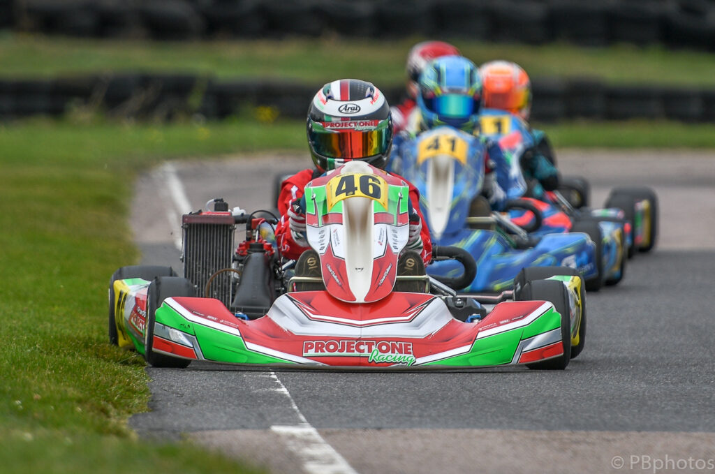 The #46 kart of O’Sullivan then pulled a gap over the battle for 2nd place, as Selvadorai set about making up for his tardy getaway, passing the GMS kart of Pullen on the 7th lap and then repeating the move on Hare on lap 10. Over the remaining 4 laps Selvadorai closed on O’Sullivan but was never able to put in a challenge, although he did set the fastest lap in his efforts to do so. The two Project One drivers had the edge on the day and there was very little to choose between them.