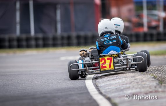 Josh Wellard took the pole with a new lap record in the Junior Max class, but couldn’t show his raw pace in the 1st Pre Final as his kart refused to progress around the warm up laps, terrible luck for the KPI driver. Sean Berry had a dropped nose penalty in the first Pre Final which was won by the LICA kart of Thomas Rotherham, he made up for that with a win in the second Pre Final and looked on course for a resounding win in the Grand Final too. Rotherham had a messy first few laps in the final, dicing with a fast Thomas Lawson and then running wide onto the back straight losing himself time. By the closing laps the top four had closed right up with the GMS kart of Berry seemingly on his way to a fine win. Both Rotherham and Lawson had worked the tow together and the blue LICA kart took Berry by complete surprise when he just edged in front going into the first chicane at the start of the last lap, this after running the length of the straight side by side. The win was Rotherham’s as he held off Berry over the last lap, Lawson and Jake Kolosowski were 3rd and 4th as the quartet crossed the line as one. It had been as tense a final as you will see anywhere, a credit to the youngsters. Josh Wellard retired on lap 6 when he was on the back bumper of Kolosowski in 5th but he had lowered his lap record further before pulling off. Ryan Chapman was 5th from Max Goodwin in 6th.