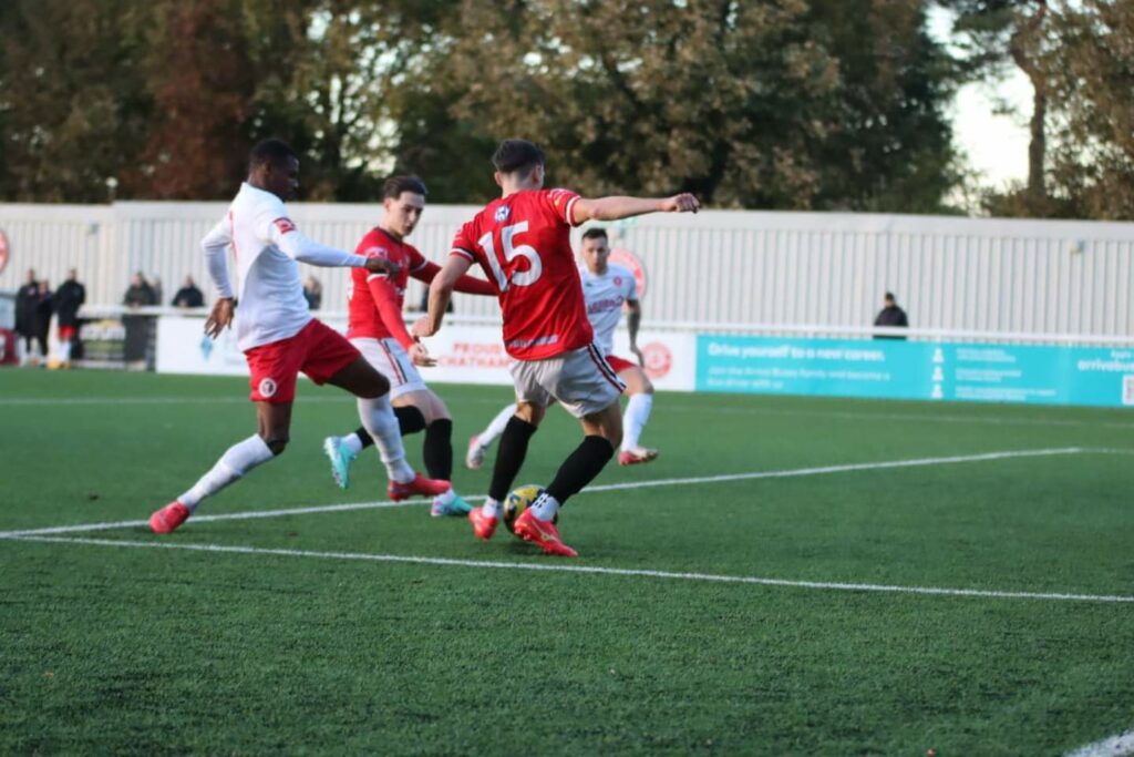This did not seem to faze Whitehawk as they still were the better side but unfortunately their final ball was not that good. Then in the 36th minute Chatham scored against the run of play when a long ball forward was flicked on by Ben Allen. The ball saw Dickson latch onto it and his low cross from the by-line to the near post was swept home by Simon Cooper.