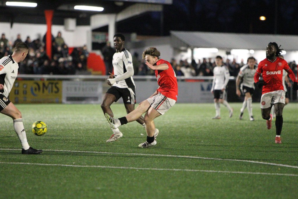 Chatham huffed and puffed looking for the equaliser while Dartford relied on breakaways. In the third minute of added on time Simon Cooper on the edge of the area saw his shot go just wide and the last chance of the game came in the sixth minute of added on time when Nathan Harvey ‘s long ball saw Fadahunsi challenging for it and off balance his shot went past the post.