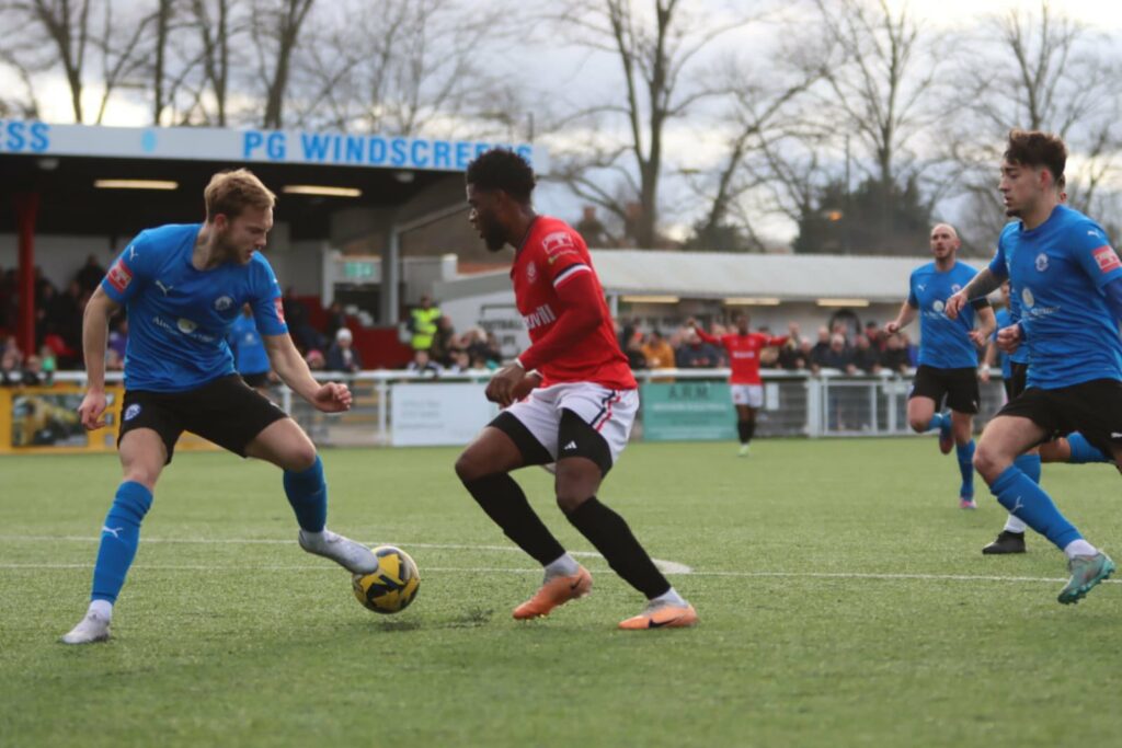 In the 32nd minute it nearly became four when Yila on the left in the area passed to Isiaka who from six yards saw his goal bound shot hit his own player Libard and Billericay cleared their lines.