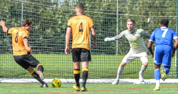 Surprisingly, the referee awarded a free kick outside the area but the assistant referee indicated that it was inside and a spot kick was awarded. The Cheshunt player took the spot kick himself but Dan Wilks read it well and not only saved, but held on to the attempted conversion.