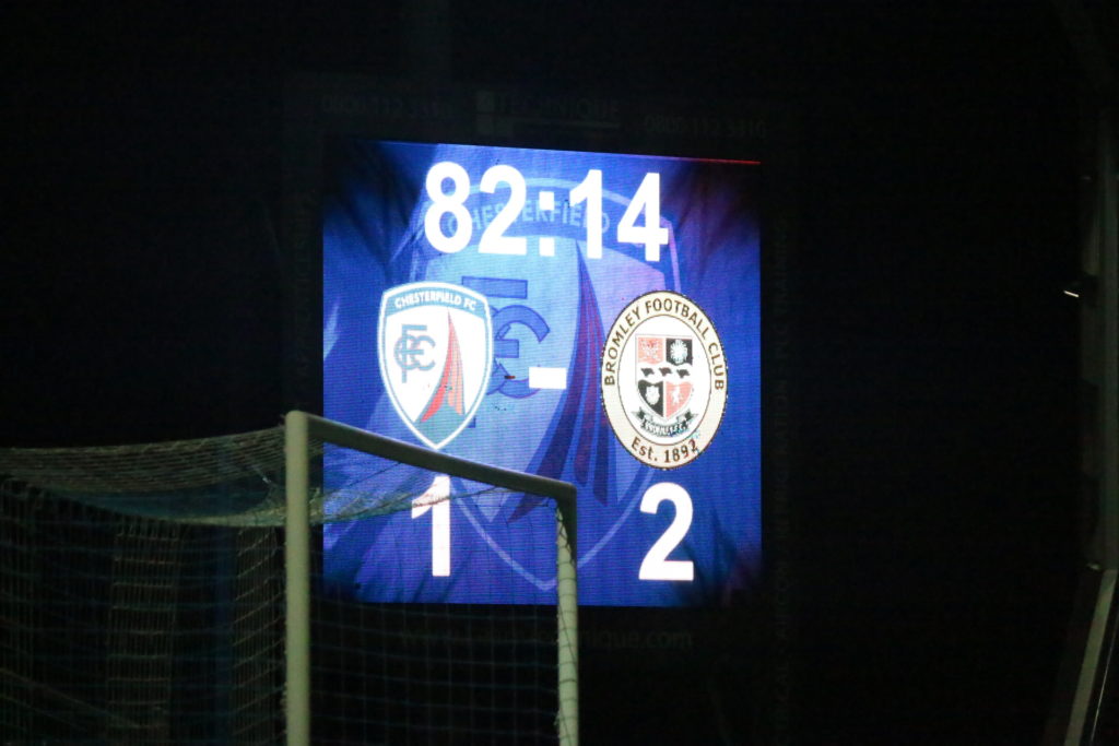 Bromley’s best opportunity fell to Michael Cheek who headed a Sam Wood cross wide and Haydn Hollis headed a free kick straight at Huddart for the home side. Despite bossing possession, however, the Spireites could not add to their goal lead.