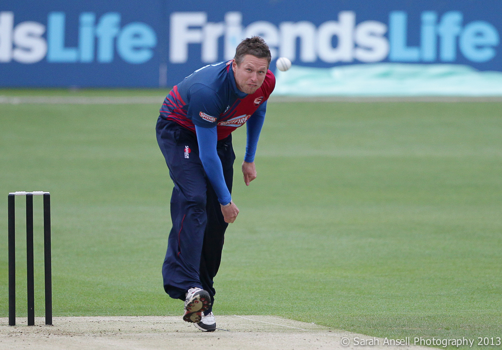 Mitchell Claydon of Kent in action during the T20 tour match between Kent & New Zealand at The Spitfire Ground, St Lawrence, Canterbury, Kent on 22 June 2013. Photo by Sarah Ansell.