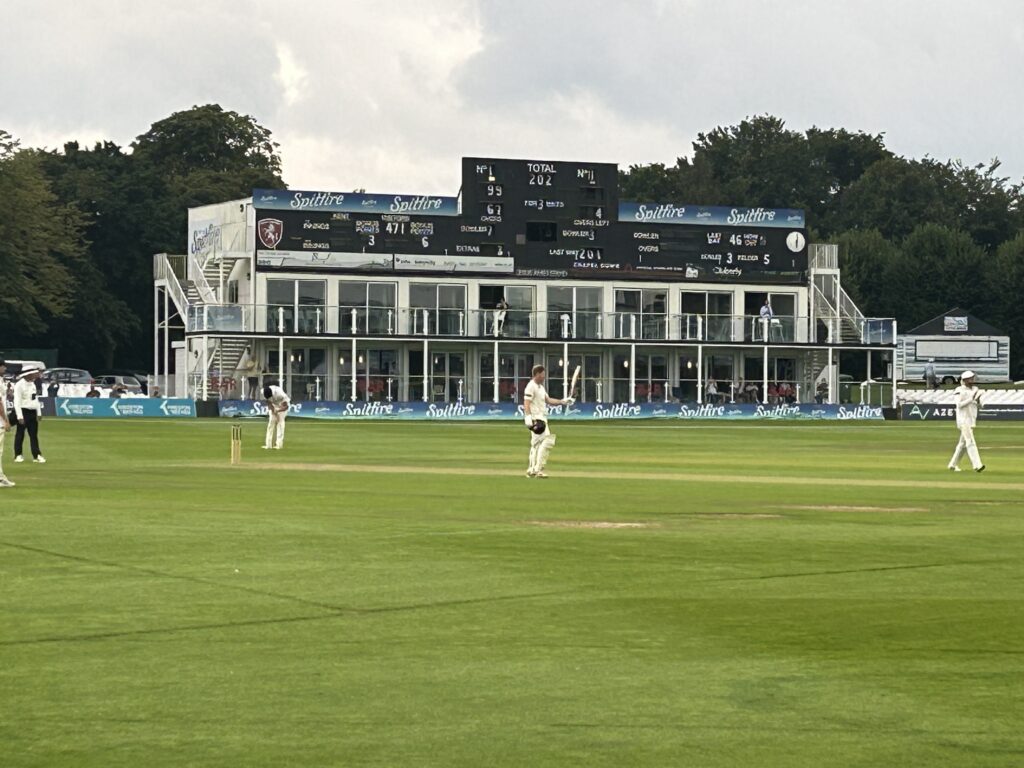 Hopes that Kent might wrap up the league leaders’ innings quickly proved to be unfounded. Starting the day two on 386 for 9 with number ten Tom Scriven on 39, and eleven Josh Hull on 12, they scored a further 85 runs, earning maximum batting bonus points.