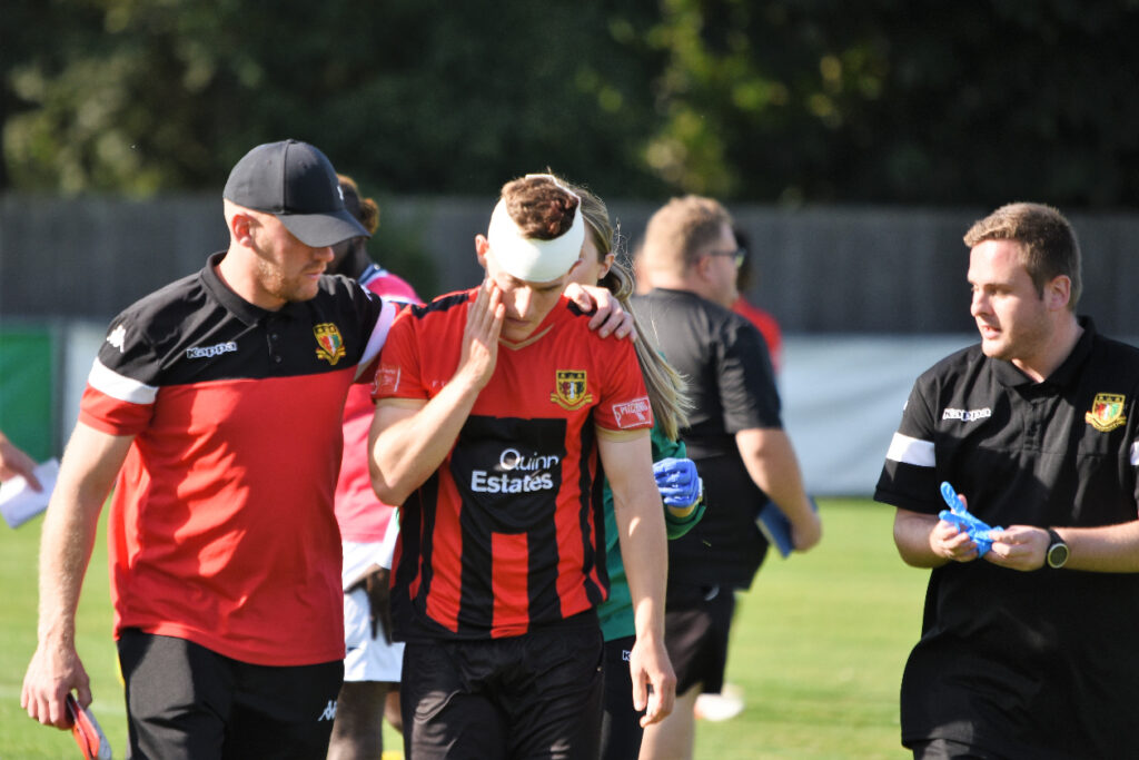 The game then turned when Mahoney caught Danny Taylor on the side of his head with his boot – leading to an eleven-minute delay – during which the Corinthian man was shown a second yellow card just minutes after being cautioned for kicking the ball away. Taylor was eventually led away head very heavily bandaged.