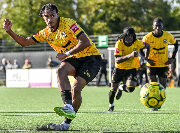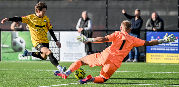 Three minutes later after a patient buildup Coker down the right found Imran Kayani whose shot was blocked and came to Nyren Clunis whose effort from 15 yards was held by Louis Rogers who had a fine game in the Hastings goal. Then, Kayani down the right fired wide.