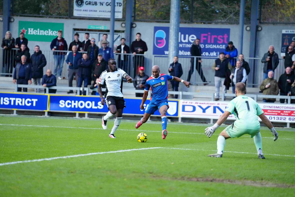 Eleven minutes remained when Dartford scored their crucial third goal. This time Dsane claimed the assist when playing it out to Box, however, the Darts’ wide man deserved all of the plaudits when he unleashed a brilliant shot from the edge of the penalty area that gave Niemczycki no chance.