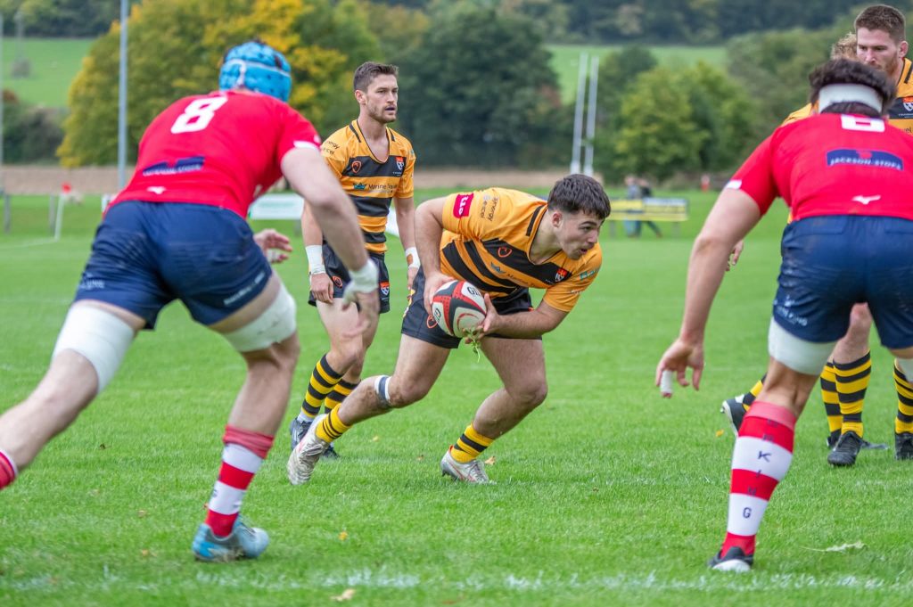 Dorking not only survived but shortly before half time produced a try of their own with full back Max Coyle making the running before Tom Hardwick got the touchdown. They were quickly on the attack in the second half and a yellow card for Olly Frostick, Canterbury’s second at this point, cost them a penalty and a close range try from Will Scholes, converted by Hardwick.