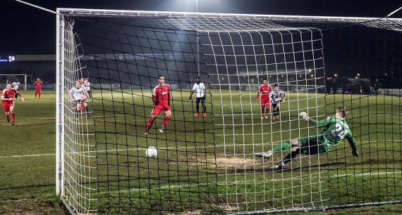 Kieron McCann was denied by a decent save from Lewington, but only seconds later fullback Ryan Cooper squared the ball along the goal-line for lively midfielder McCann to tap in Folkestone’s third and Taylor deservedly made it four on the stroke of half-time.