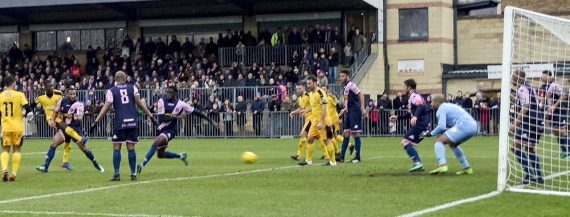 Dulwich had the ball in the net on nine minutes, but had that effort ruled out, and then, as at Margate on New Years’ Day, Folkestone took the game to them and went ahead when Ade Yusuff fired low through a crowded area to beat keeper Preston Edwards just before the half hour mark.